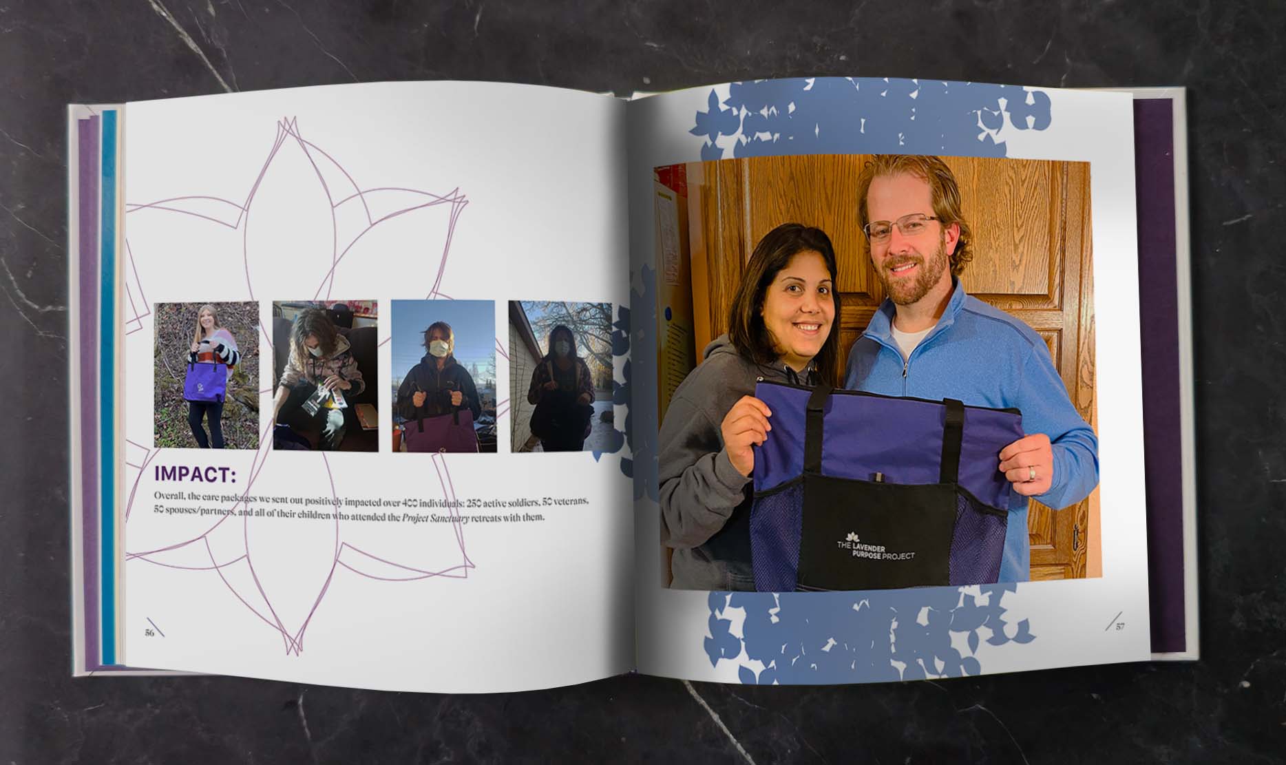 This book serves a dual purpose. First and foremost, it documents my partnership with Project Sanctuary through a proposal I submitted through my agency of employment, Patients & Purpose. Each year Patients & Purpose reviews proposals for volunteer efforts of their employees through an initiative it began called The Lavender Purpose Project. In 2020 my proposal was accepted. The agency awarded me a total of $10,000 to bring my proposal to life. I chose to work with Project Sanctuary, a Denver Colorado based non-profit that focuses on suicide prevention of military vets and their families. The original plan to go out there in person had to shift with the rise of the pandemic so we decided to create care packages geared towards the vets and their families on Project Sanctuary retreats. We also created 250 care packages that were sent to military training camps to bring them awareness of Project Sanctuary’s work in case they ever found themselves in a situation where they need the assistance of the professionals at Project Sanctuary. Our efforts reached over 400 individuals dealing with suicide prevention as well as families that needed assistance reconnecting with their loved ones that now felt hopeless after serving our country. The second purpose of this book focuses on the font I created out of the lotus flower graphic that is part of The Lavender Purpose Project logo. The font weaves in and out of my story while showcasing letterforms to emphasize words that define The Lavender Purpose Project.